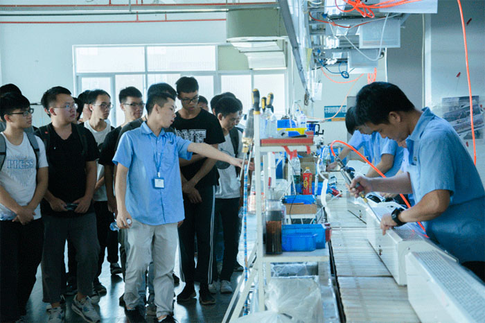 廣工學子走進嶄新寬敞的生產(chǎn)大樓,參觀自動化生產(chǎn)線、進口的智能生產(chǎn)與檢測設(shè)備、以及長期運行實驗室、環(huán)境模擬實驗室等實驗室,深入了解公司的研發(fā)方向、研發(fā)成果、工藝技術(shù)以及生產(chǎn)流程等。